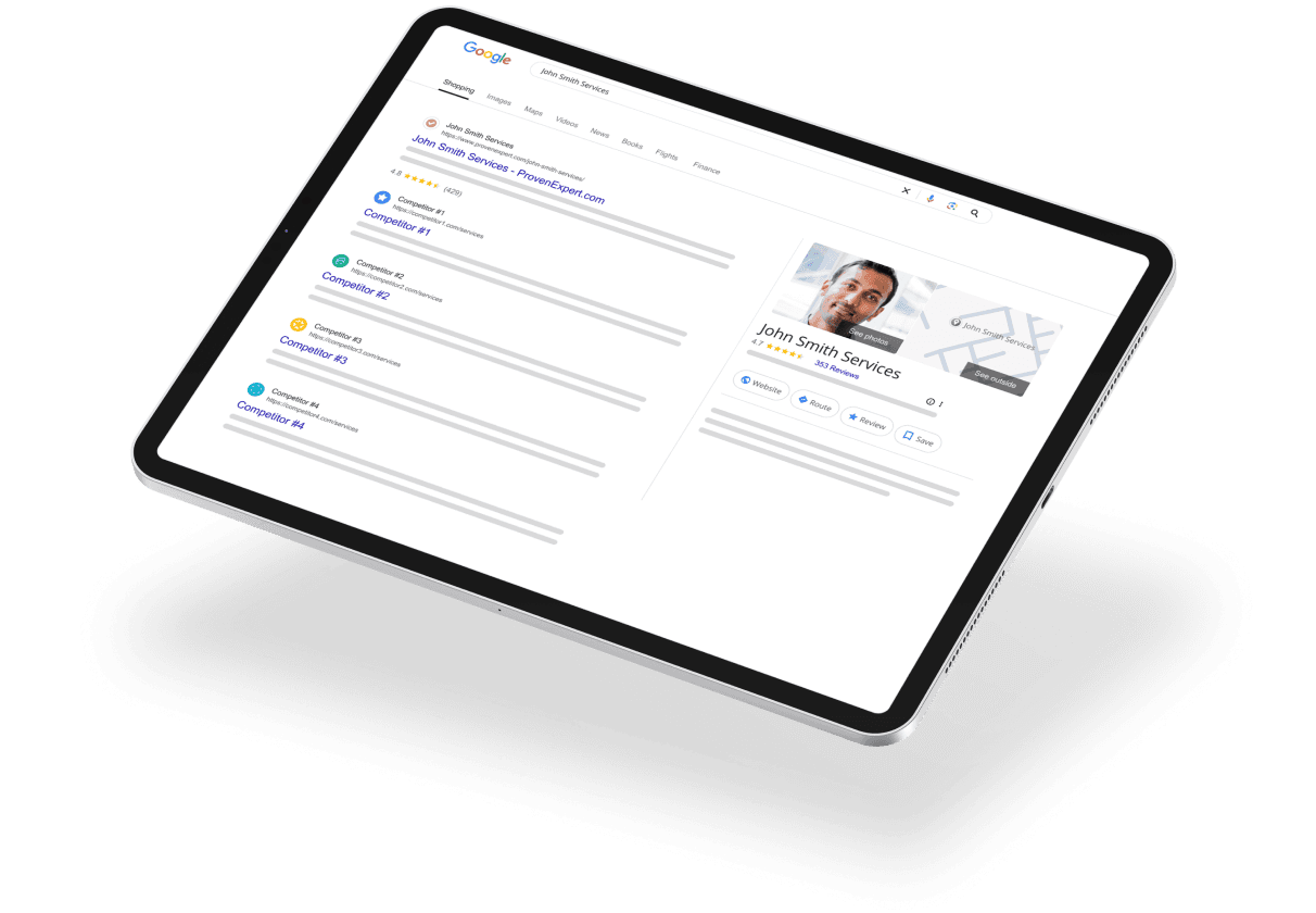 Your ProvenExpert profile is automatically optimized for search engines such as Google to make sure potential customers can easily find you over the competition. Get improved visibility, more clicks, and more new customers with Google star ratings listed in your ProvenExpert profile, in your Google listings, and on your own website.