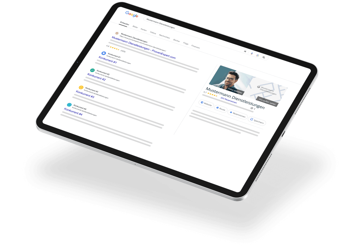 Werden Sie zum Star in den Suchergebnissen: Ihr ProvenExpert-Profil ist so optimiert, dass Sie bei Google & Co. ganz weit oben stehen. Die Bewertungssterne Ihres Profils sorgen in den Google-Suchergebnissen für maximale Aufmerksamkeit.